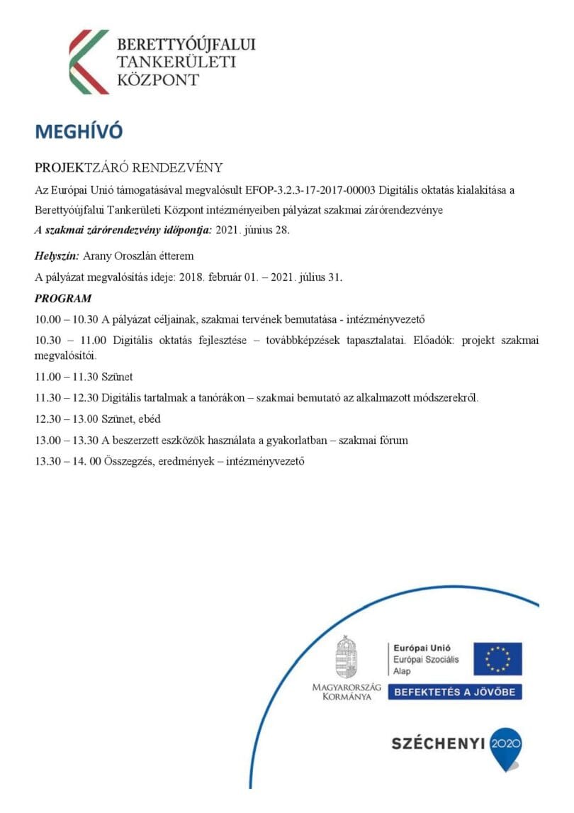 A projekt intézményi zárására 2021. június 28-án Tanévzáró Nevelőtestületi értekezletet követően implementációt támogató eseménnyel zárult, amelynek meghívója iskolánk honlapjára érhető el.