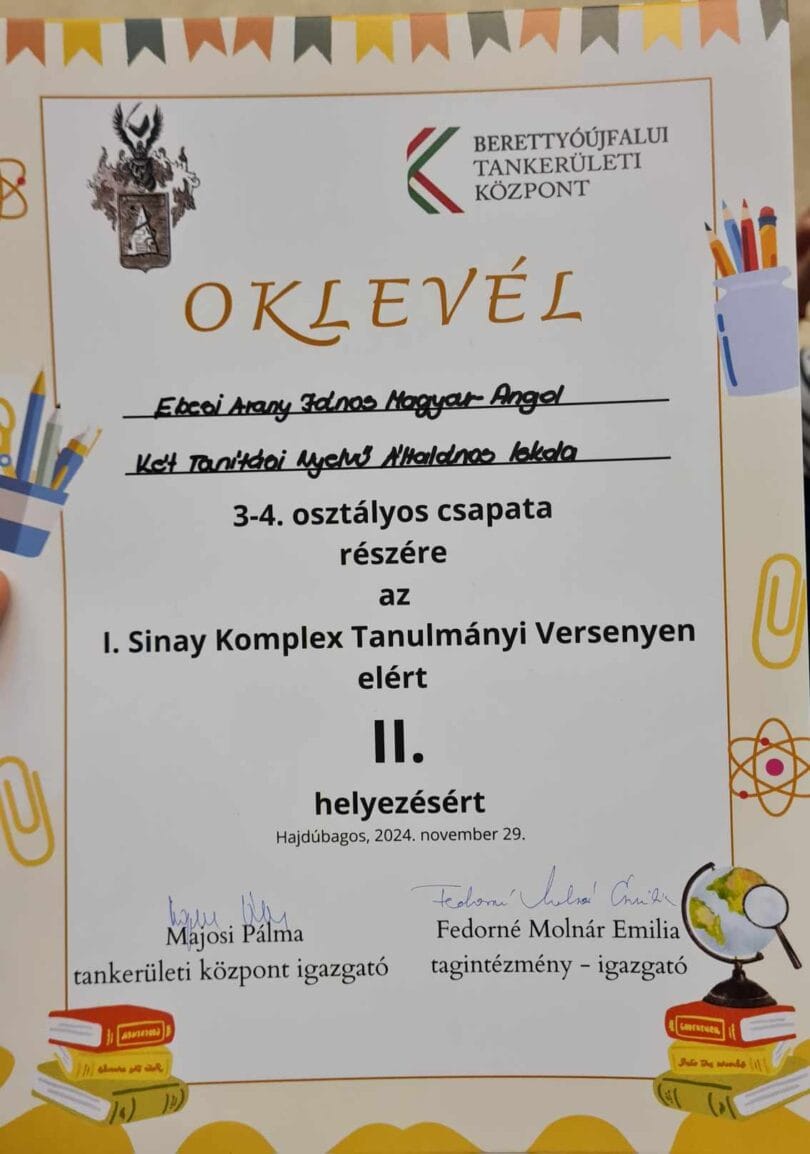 A Berettyóújfalui Tankerületi Központ támogatásával a Hosszúpályi Irinyi József Általános Iskola Sinay Miklós Tagiskolája 2024. november 29-én rendezte meg Hajdúbagoson az I. Sinay Komplex Tanulmányi Versenyt, melyre iskolánk alsó tagozatából két csapat is indult.