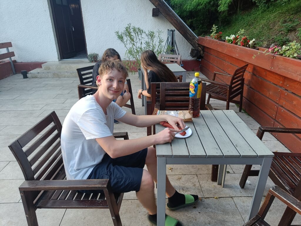 Kellemes szállásunkon pillanatok alatt elfogyasztottuk a finom vacsorát, melyet vérmes lézerharc követett, amibe társaságunk felnőtt tagjai is gyermeki lelkesedéssel kapcsolódtak be. Az este megkoronázásaként a lelkesebbekkel még kilátogattunk a sportcentrumba egy kis focizásra, a többiek kártyacsatákkal múlatták az időt.