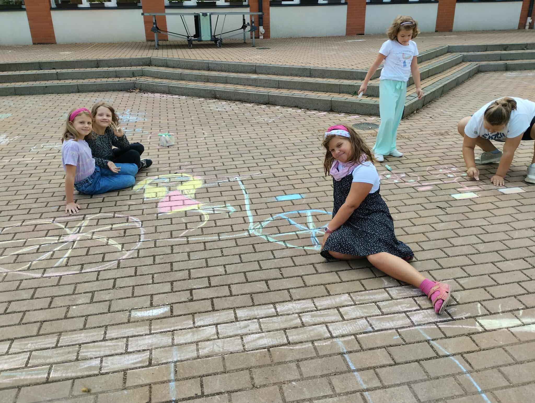 Csodálatos aszfaltrajzok készültek KRESZ témakörben az iskola díszudvarán rajz órákon.