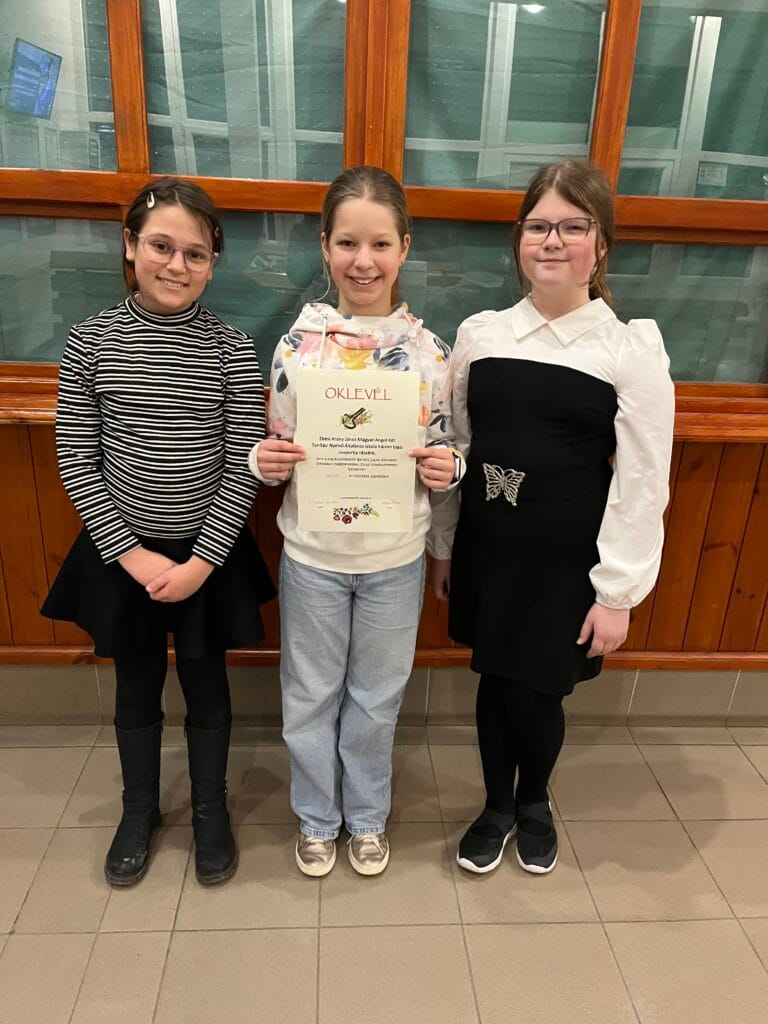 Iskolánkból egy három tagú énekegyüttes nevezett a népdaléneklési versenyre. Résztvevő tanulóink: Nagy Rebeka (5. A), Daróczi Léna (5. B), Maier Emma (6. B). A lányok nagyon szorgalmasan készültek, és ügyesen szerepeltek ezen a színvonalas versenyen. Ennek eredményeképpen ezüst minősítést kaptak a zsűritől.
