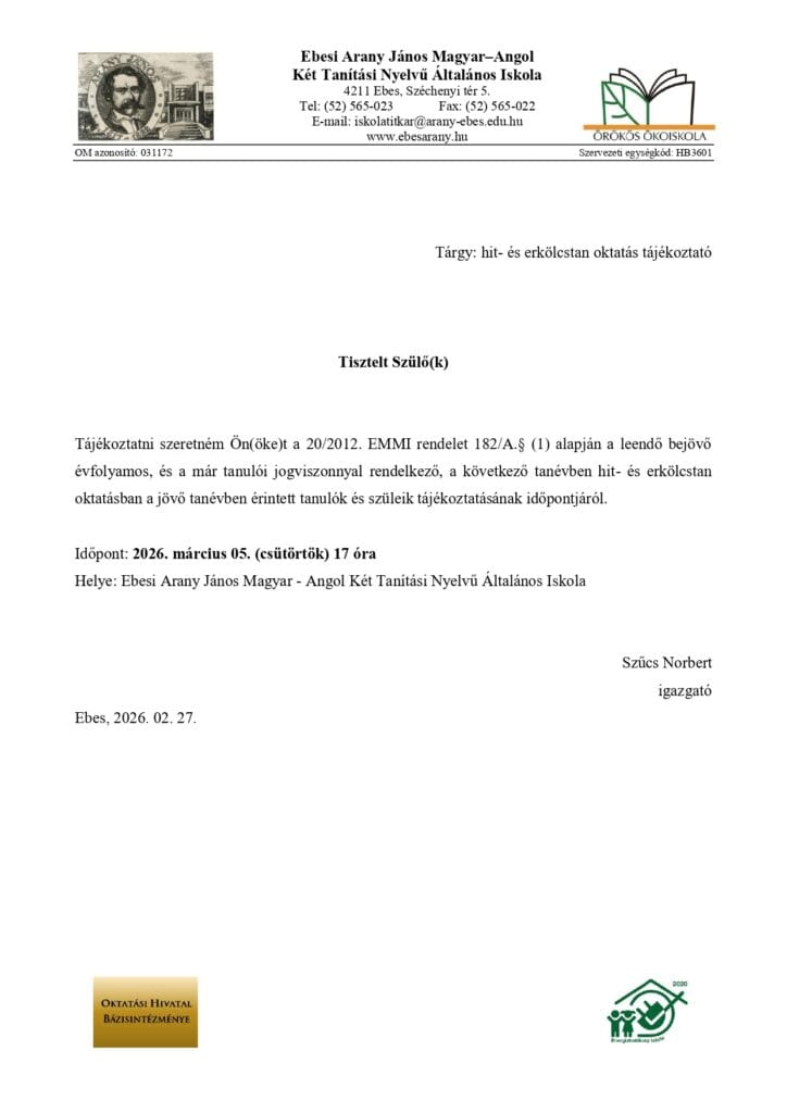 Hit- és erkölcstan oktatás tájékoztató nap 2026. március 5-én