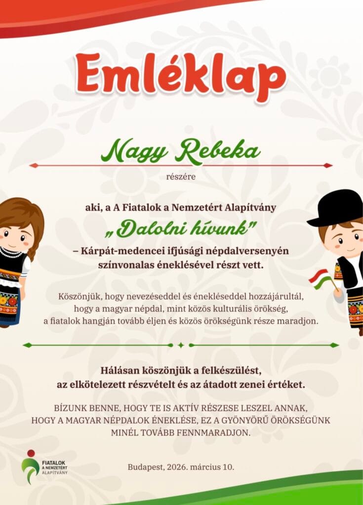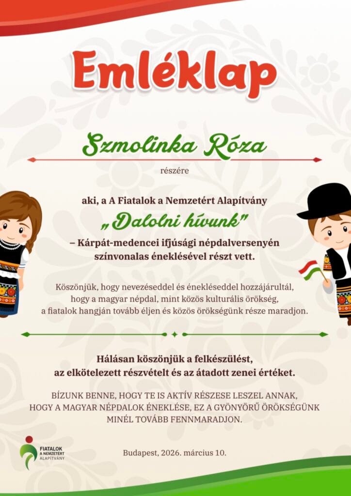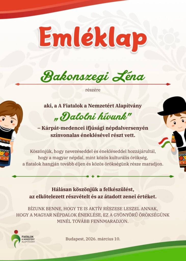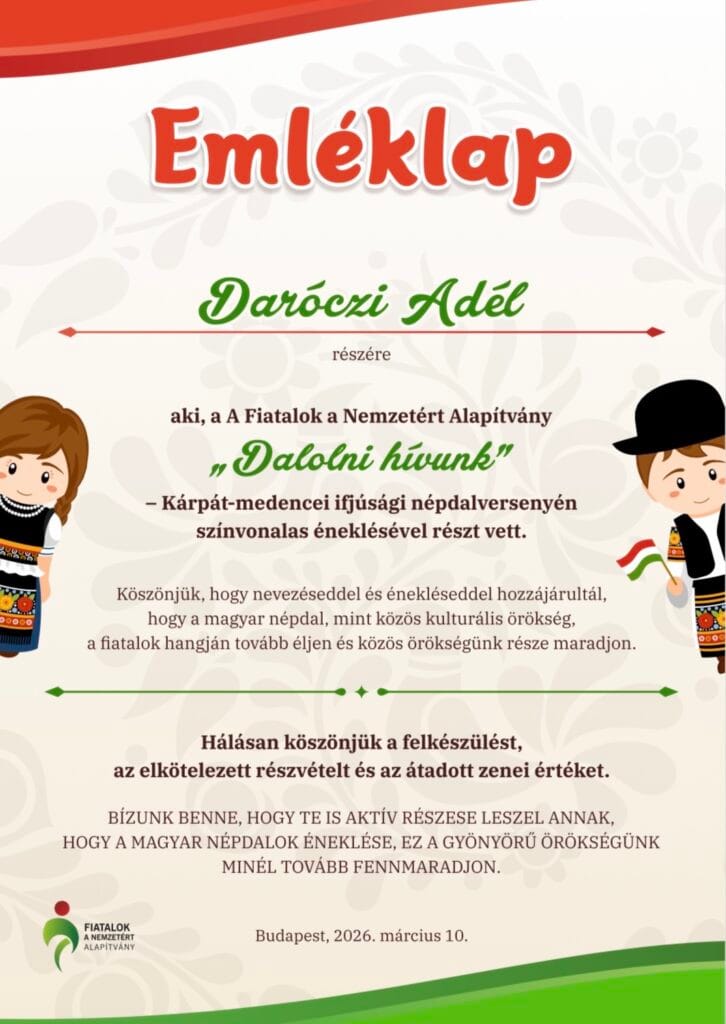 Négy tanulónk indult a „Dalolni hívunk!” online népdaléneklési versenyen: Bakonszegi Léna, Nagy Rebeka, Daróczi Adél, Szmolinka Róza (az ötödik évfolyamról). 2025. december 31-éig kellett három magyar népdalt felénekelniük egy-egy videófelvételre, majd azt elküldeni. A verseny 2026. március 10-én zárult. Az emléklapokat 2026. március 15-éig kaptuk meg. Több mint 500 versenyző közül most nem sikerült helyezést elérnünk, de egy-egy versennyel nem is feltétlenül ez a cél, vagy nem csak ez. Hiszen a felkészüléskor sokat lehet tanulni, fejlődni; és érzelmileg, zeneileg is gazdagodni. Ez a rejtett jutalma a megmérettetéseknek.