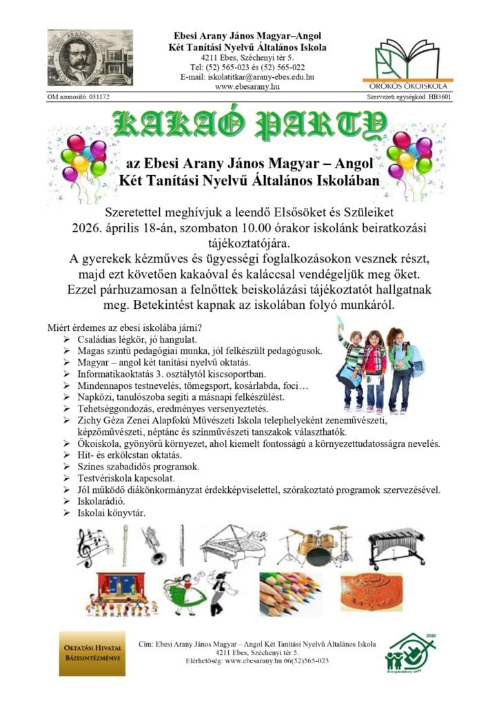 Kakaó Party (2026. április 18.) meghívó leendő elsősöknek és szüleiknek