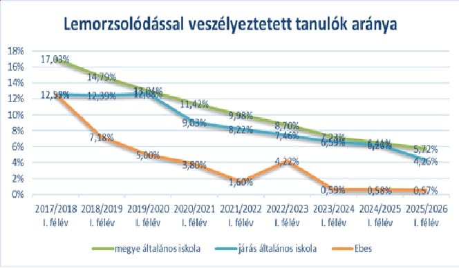 Kiemelkedő eredményünket az alábbi grafikonon jelenítettük meg, miszerint az elmúlt években a vármegyei és a hajdúszoboszlói járási általános iskoláknál is minden évben kevesebb tanulónk volt, aki a lemorzsolódásban veszélyeztetettként érintett lett volna!